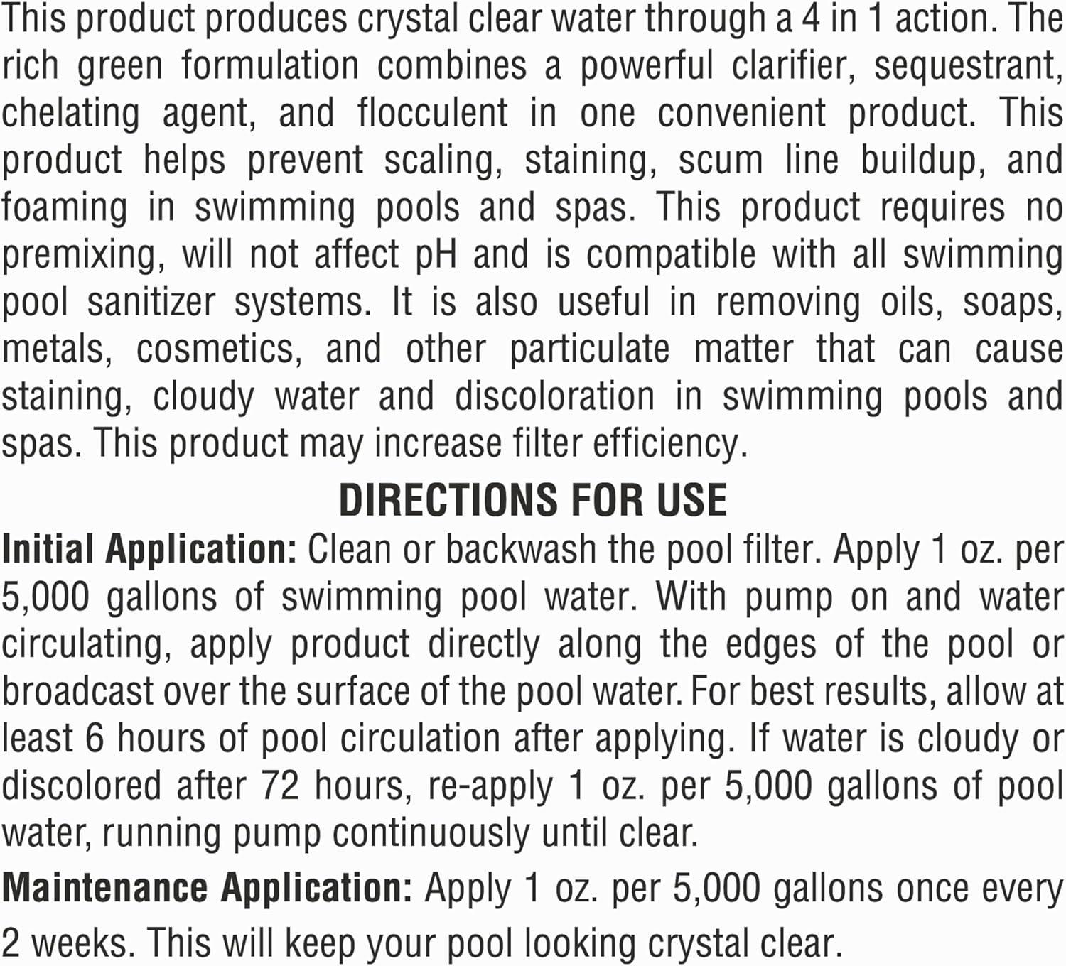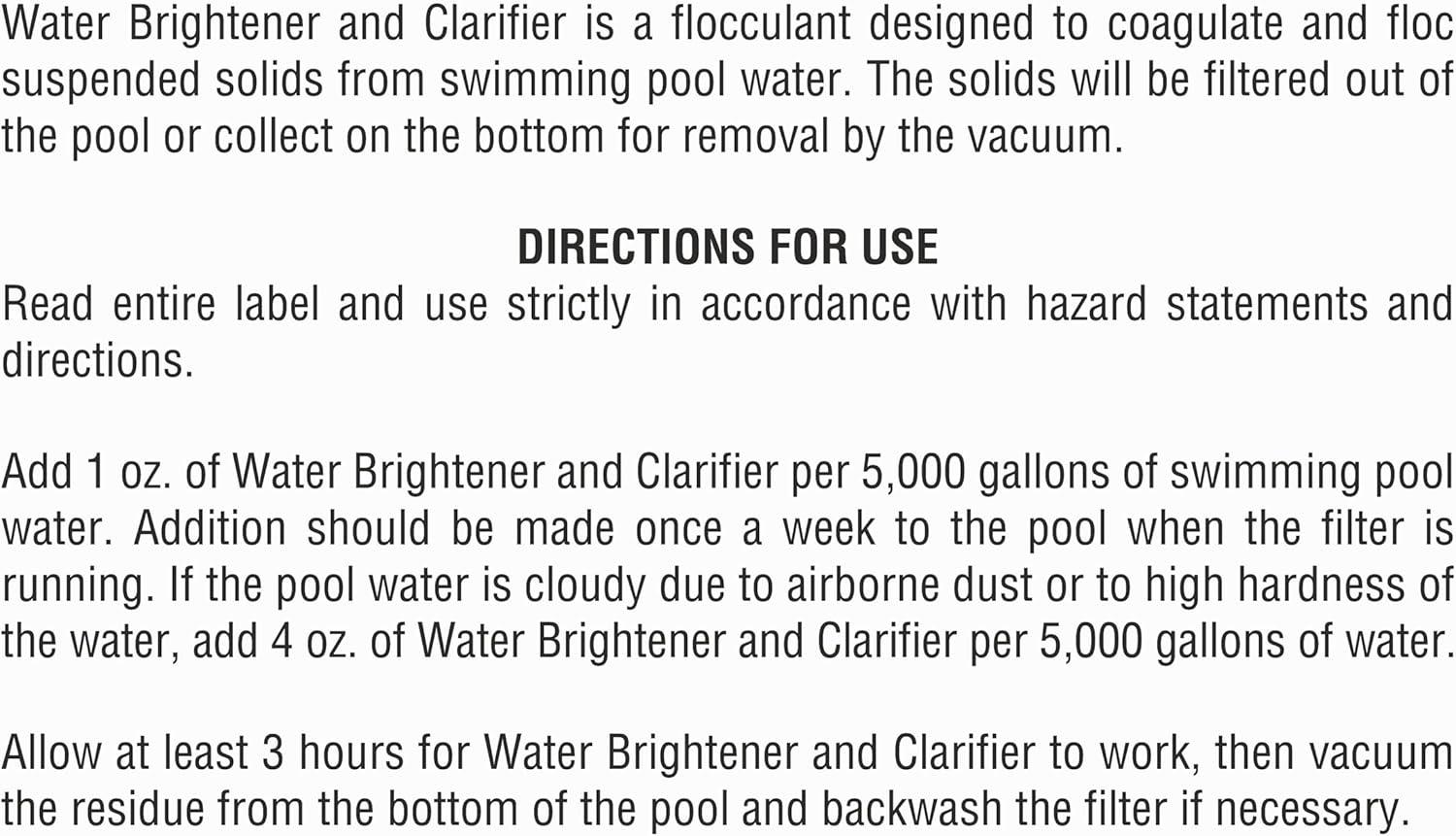 This is a flocculant designed to coagulate and floc suspended solids from swimming pool water. The solids will be filtered out of the pool or collect on the bottom for removal by the vacuum. Add 1 oz. of Clear Pool Water Clarifier per 5,000 gallons of swimming pool water. Addition should be made once a week to the pool when the filter is running. If the pool water is cloudy due to airborne dust or to high hardness of the water, add 4 oz. of Clear Pool Water Clarifier per 5,000 gallons of water. Allow at least 3 hours for Clear Pool Water Clarifier to work, then vacuum the residue from the bottom of the pool and backwash the filter if necessary.