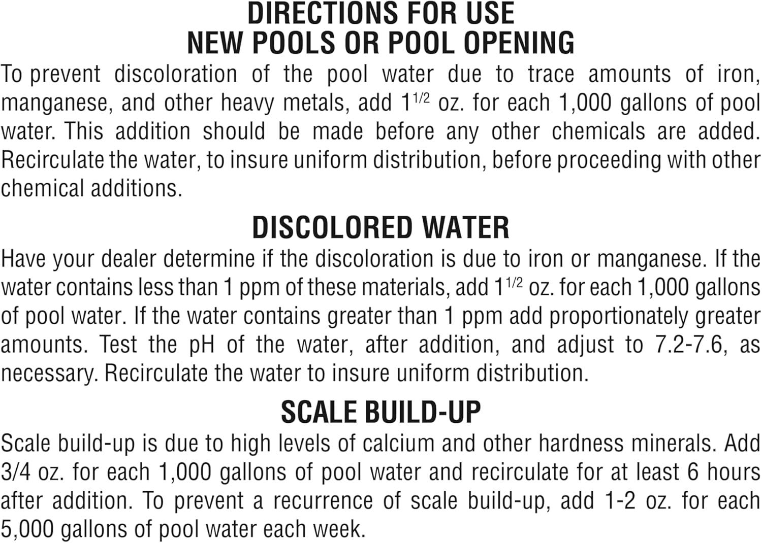 This product helps prevent discoloration of pool water due to iron, calcium, manganese, copper and other metals and minerals which may be present in the water supply. This product is an excellent general purpose sequestrant which helps protect plumbing and pool walls from rust, stain and scale. It should be used for all pool openings and closings and throughout the season as needed. For initial filling of pool, if iron or other metallic contaminants are suspected, add one quart of Metal Free for each 10,000 gallons of pool water. Add Metal Free while the pool is being filled and before chlorine is added. To correct an existing colored water problem (due to the presence of minerals in the pool water), first close the pool to all swimmers. Leave the filter pump running. Stop chlorinating the pool and allow the chlorine level to drop to zero. Lower the pH of the pool water to 6.8 with pH Lower, lowering the pH will re-dissolve the metallic impurities. Add one quart of Metal Free per 10,000 gallons of water and allow the pool water to circulate overnight, or until the water is clear. Re-adjust the pH of the pool water between 7.2-7.8 with pH Rise. Begin normal chlorination and pool operation. Swimming may resume when chlorine residual is 1.0-3.0 ppm. To make up for loss of Metal Free due to backwashing and/or splash-out, add one quart of Metal Free for each 20,000 gallons of pool water, once each month.