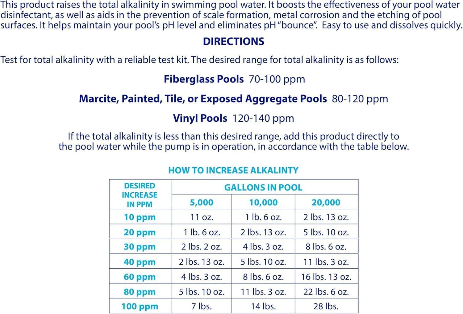2256 Quantity: 10 lbs Features: -Alkalinity control. -Raises total alkalinity and helps keep pH stable. -100% Sodium hydrogen carbonate. Chemical Type: -PH Adjustment.