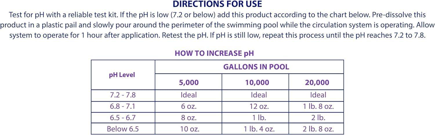Test for pH with a reliable test kit. If the pH is low (7.2 or below) add this product according to the included chart. Pre-dissolve this product in a plastic pail and slowly pour around the perimeter of the swimming pool while the circulation system is operating. Allow system to operate for 1 hour after application. Retest the pH. If pH is still low, repeat this process until the pH reaches 7.4 to 7.6.