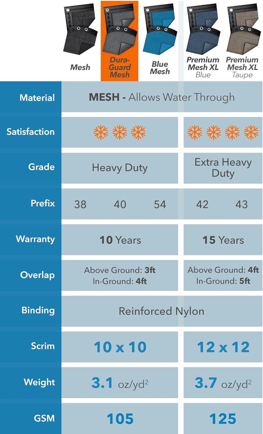 The Robelle Dura-Guard Mesh Winter Pool Cover is a heavy-duty mesh winter pool cover. Mesh pool covers allow water to pass through their material. This is a heavy-duty pool cover designed to protect your pool from the winter elements. Customers buy mesh pool covers because they require less maintenance than solid pool covers during the winter months. Mesh pool covers are also good for high wind situations as the material sits in the pool water. Pool owners that use a mesh pool cover typically will have additional work cleaning their pool in the spring before opening. The Robelle Dura-Guard Mesh Winter Pool Cover features gray and black woven colors. Please order by your pool size, as the overlap goes beyond the pool size listed. This cover includes a three-foot overlap. If you have a very large top rail, please consider a larger pool size. This cover should be able to comfortably float in the pool water without excessive stress. This cover is not meant to be used as a debris cover during the swimming season. This winter pool cover is intended to be used during the off-season. This cover is meant for traditional above ground pools with a traditional top rail. Includes a winch and cable that should be used to secure your pool cover through the grommets around the perimeter of the pool cover. For extra securing, cover clips and cover wrap (both sold separately) are suggested for pool closing. No other method of installation is recommended. Includes a ten year warranty.