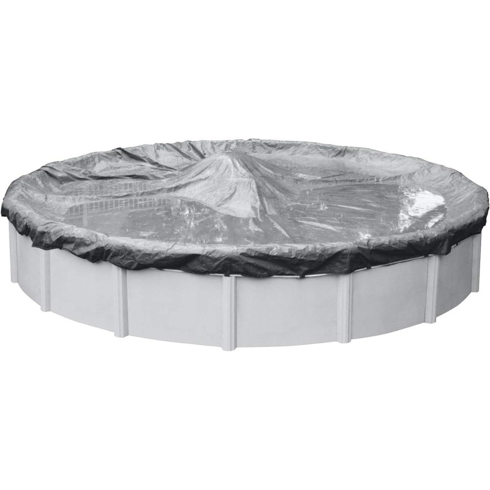 The Robelle Platinum Winter Pool Cover is an Professional-Grade solid winter pool cover. Solid pool covers do not allow water to pass through their material. The Robelle Platinum Winter Pool Cover features an Professional-Grade 12 x 12 scrim. The Professional-Grade polyethylene material used for this cover weighs 3.7 oz./yd2. Both the scrim count and material weight are the best indicators of the strength and durability for your pool cover. This is an Professional-Grade pool cover designed to protect your pool from the winter elements. The Robelle Platinum Winter Pool Cover features a platinum topside and a black underside. Please order by your pool size, as the overlap goes beyond the pool size listed. This cover includes a four-foot overlap. If you have a very large top rail, please consider a larger pool size. This cover should be able to comfortably float on the pool water without excessive stress. This cover is not meant to be used as a debris cover during the swimming season. This winter pool cover is intended to be used during the off-season. This cover is meant for traditional above ground pools with a traditional top rail. Includes a winch and cable that should be used to secure your pool cover through the grommets around the perimeter of the pool cover. For extra securing, cover clips and cover wrap (both sold separately) are suggested for pool closing. No other method of installation is recommended. Includes a fifteen year warranty.