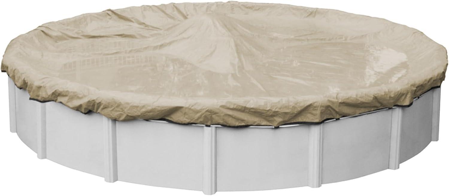 The Robelle Defender Winter Pool Cover is an extra heavy-duty solid winter pool cover. Solid pool covers do not allow water to pass through their material. The Robelle Defender Winter Pool Cover features an extra heavy-duty 12 x 12 scrim. The extra heavy-duty polyethylene material used for this cover weighs 3.26 oz./yd2. Both the scrim count and material weight are the best indicators of the strength and durability for your pool cover. This is an extra heavy-duty pool cover designed to protect your pool from the winter elements. The Robelle Defender Winter Pool Cover features a sandstone topside and a black underside. Please order by your pool size, as the overlap goes beyond the pool size listed. This cover includes a four-foot overlap. If you have a very large top rail, please consider a larger pool size. This cover should be able to comfortably float on the pool water without excessive stress. This cover is not meant to be used as a debris cover during the swimming season. This winter pool cover is intended to be used during the off-season. This cover is meant for traditional above ground pools with a traditional top rail. Includes a winch and cable that should be used to secure your pool cover through the grommets around the perimeter of the pool cover. For extra securing, cover clips and cover wrap (both sold separately) are suggested for pool closing. No other method of installation is recommended..