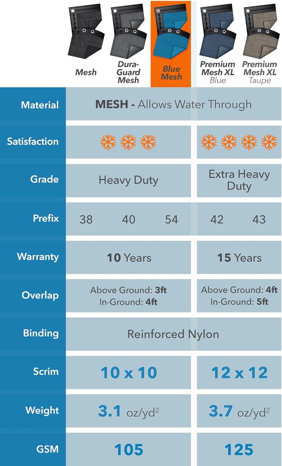 The Robelle Blue Mesh Winter Pool Cover is a heavy-duty mesh winter pool cover. Mesh pool covers allow water to pass through their material. This is a heavy-duty pool cover designed to protect your pool from the winter elements. Customers buy mesh pool covers because they require less maintenance than solid pool covers during the winter months. Mesh pool covers are also good for high wind situations as the material sits in the pool water. Pool owners that use a mesh pool cover typically will have additional work cleaning their pool in the spring before opening. The Robelle Blue Mesh Winter Pool Cover features a blue color. Please order by your pool size, as the overlap goes beyond the pool size listed. This cover includes a four-foot overlap. Please order a larger size cover if you have steps (or any other irregularity) protruding from your pool. Water tube loops are placed around the perimeter of the pool cover. Water tubes sold separately. Only water tubes should be used to install this pool cover. No other method of installation is recommended. This cover should be able to comfortably float in the pool water without excessive stress. This cover is not meant to be used as a debris cover during the swimming season. This winter pool cover is intended to be used during the off-season..