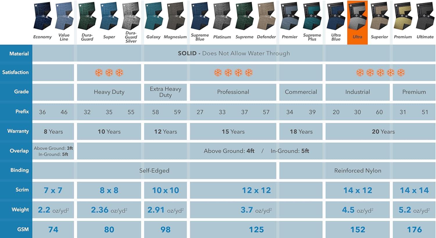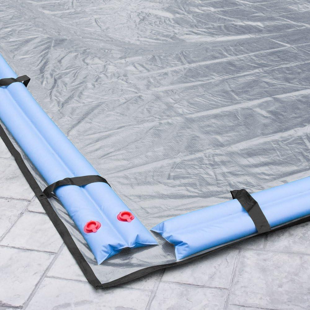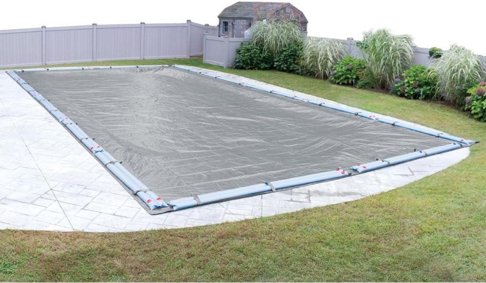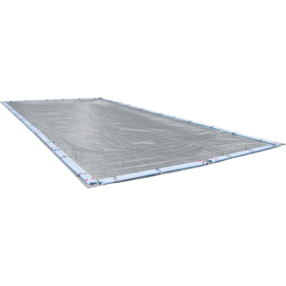 The Robelle Dura-Guard Silver Winter Pool Cover is a heavy-duty solid winter pool cover. Solid pool covers do not allow water to pass through their material. The Robelle Dura-Guard Silver Winter Pool Cover features a heavy-duty 8 x 8 scrim. The heavy-duty polyethylene material used for this cover weighs 2.36 oz./yd2. Both the scrim count and material weight are the best indicators of the strength and durability for your pool cover. This is a heavy-duty pool cover designed to protect your pool from the winter elements. The Robelle Dura-Guard Silver Winter Pool Cover features a silver topside and a black underside. Please order by your pool size, as the overlap goes beyond the pool size listed. This cover includes a five-foot overlap. Please order a larger size cover if you have steps (or any other irregularity) protruding from your pool. Water tube loops are placed around the perimeter of the pool cover. Water tubes sold separately. Only water tubes should be used to install this pool cover. No other method of installation is recommended. This cover should be able to comfortably float on the pool water without excessive stress. This cover is not meant to be used as a debris cover during the swimming season. This winter pool cover is intended to be used during the off-season. Includes a ten year warranty.