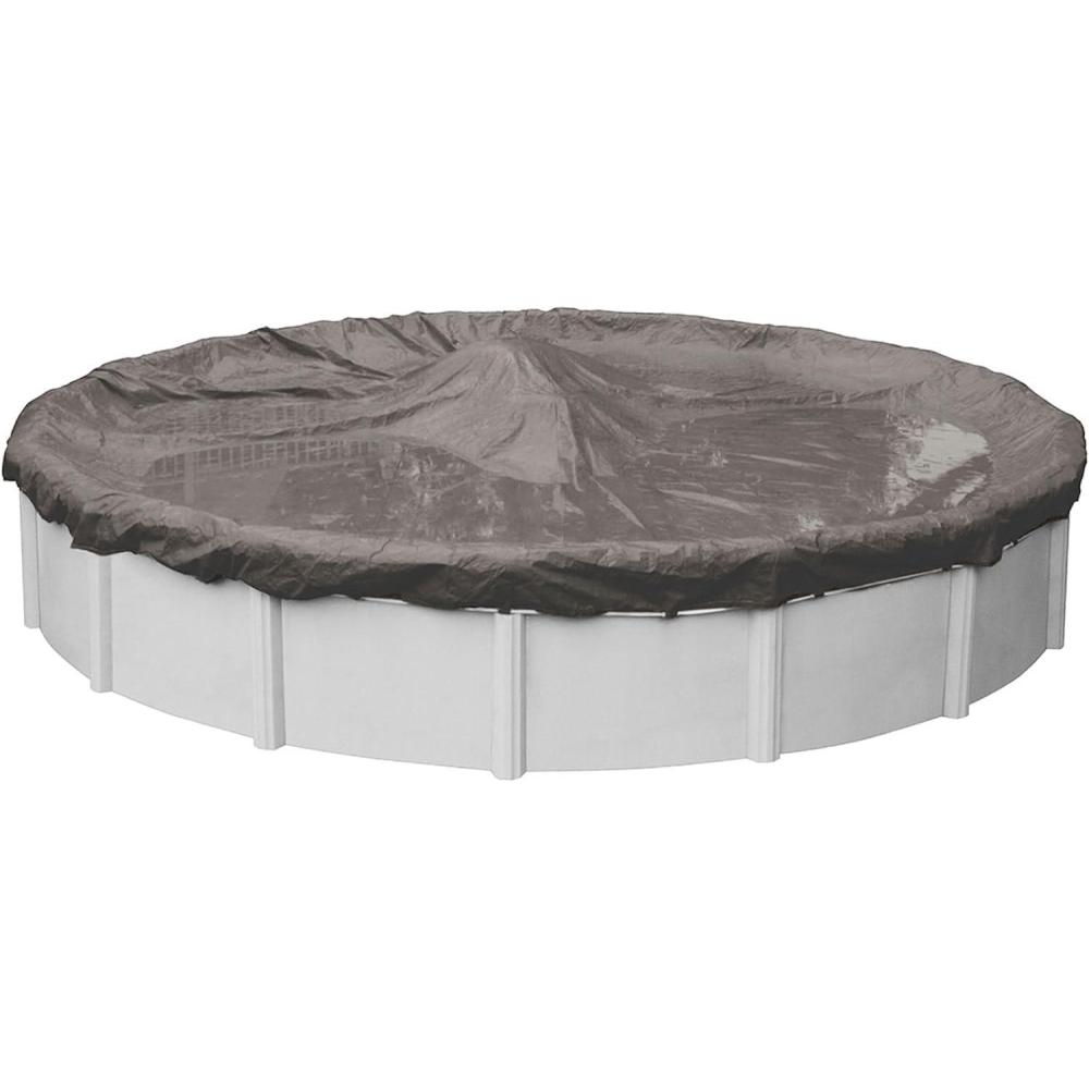 This is a premium-grade solid winter pool cover. Solid pool covers do not allow water to pass through their material. This pool cover features a premium-grade 14 x 14 scrim. The premium-grade polyethylene material used for this cover weighs 5.2 oz./yd2. Both the scrim count and material weight are the best indicators of the strength and durability for your pool cover. A pool cover with a extremely high scrim count and a heavy material, like this one, will last longer than any other pool cover. This is a premium-grade pool cover designed to protect your pool from all winter elements. This pool cover has a black underside. This pool cover includes a perimeter binding. Please order by your pool size, as the overlap goes beyond the pool size listed. This cover includes a four-foot overlap. If you have a very large top rail, please consider a larger pool size. This cover should be able to comfortably float on the pool water without excessive stress. This cover is not meant to be used as a debris cover during the swimming season. This winter pool cover is intended to be used during the off-season. This cover is meant for traditional above ground pools with a traditional top rail. Includes a winch and cable that should be used to secure your pool cover through the grommets around the perimeter of the pool cover. For extra securing, cover clips and cover wrap (both sold separately) are suggested for pool closing. No other method of installation is recommended. Includes a twenty year warranty.