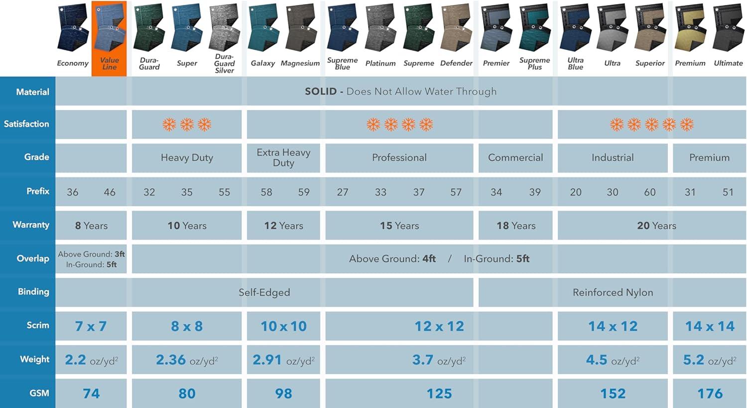 The Robelle Value-Line Winter Pool Cover is a solid winter pool cover. Solid pool covers do not allow water to pass through their material. The Robelle Value-Line Winter Pool Cover features a 7 x 7 scrim. The polyethylene material used for this cover weighs 2.2 oz./yd2. The Robelle Value-Line Winter Pool Cover features an azure blue topside and a black underside. Please order by your pool size, as the overlap goes beyond the pool size listed. This cover includes a three-foot overlap. If you have a large top rail, please consider a larger pool size. This cover should be able to comfortably float on the pool water without excessive stress. This cover is not meant to be used as a debris cover during the swimming season. This winter pool cover is intended to be used during the off-season. This cover is meant for traditional above ground pools with a traditional top rail. Includes a winch and cable that should be used to secure your pool cover through the grommets around the perimeter of the pool cover. For extra securing, cover clips and cover wrap (both sold separately) are suggested for pool closing. No other method of installation is recommended..