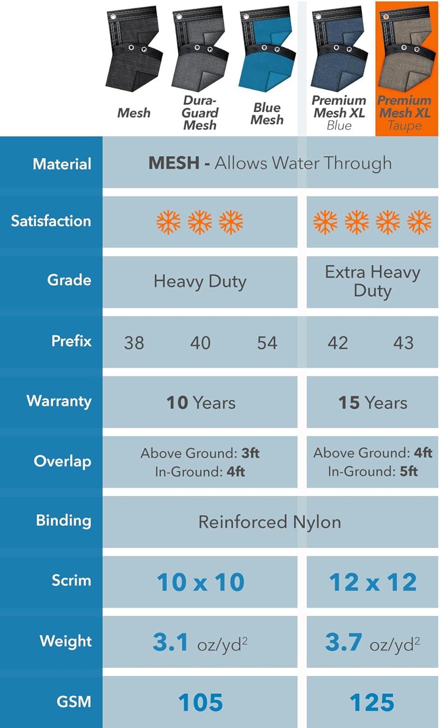 This Extra Heavy Duty XL Mesh pool cover is constructed with extra heavy duty polyethylene that weighs 3.7 ounces per square yard (125 grams per square meter). The material is woven with a 12 x 12 scrim. Scrim is the number of threads per square inch. Material weight and scrim are the best indicators of the overall durability and expected longevity of your pool cover.