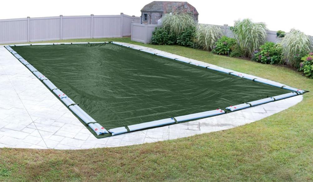 The Robelle Dura-Guard Winter Pool Cover is a heavy-duty solid winter pool cover. Solid pool covers do not allow water to pass through their material. The Robelle Dura-Guard Winter Pool Cover features a heavy-duty 8 x 8 scrim. The heavy-duty polyethylene material used for this cover weighs 2.36 oz./yd2. Both the scrim count and material weight are the best indicators of the strength and durability for your pool cover. This is a heavy-duty pool cover designed to protect your pool from the winter elements. The Robelle Dura-Guard Winter Pool Cover features a green topside and a black underside. Please order by your pool size, as the overlap goes beyond the pool size listed. This cover includes a five-foot overlap. Please order a larger size cover if you have steps (or any other irregularity) protruding from your pool. Water tube loops are placed around the perimeter of the pool cover. Water tubes sold separately. Only water tubes should be used to install this pool cover. No other method of installation is recommended. This cover should be able to comfortably float on the pool water without excessive stress. This cover is not meant to be used as a debris cover during the swimming season. This winter pool cover is intended to be used during the off-season. Includes a ten year warranty.