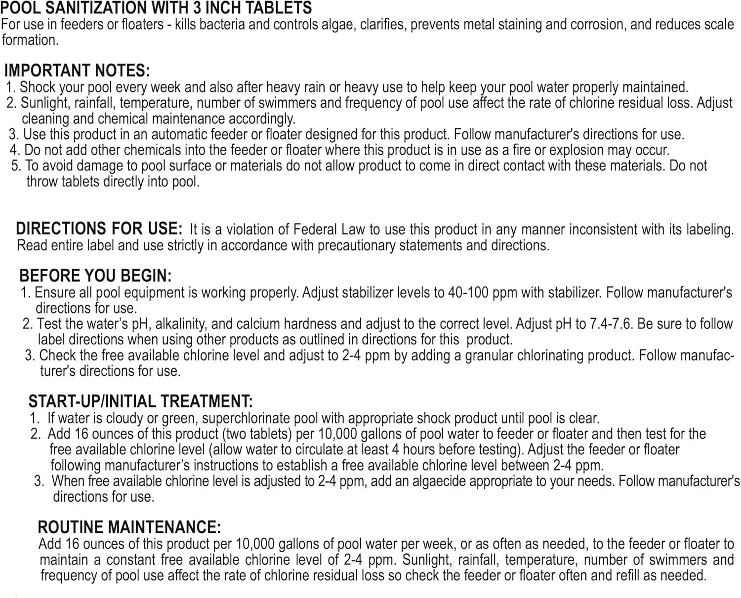 Pool sanitization with 3 Inch Tablets. For use in feeders or floaters. Kills bacteria and controls algae, clarifies, prevents metal staining and corrosion, and reduces scale formation. A) Important Notes: 1. Shock your pool every week. 2. Sunlight, rainfall, temperature, number of swimmers and frequency of pool use affect the rate of chlorine residual loss. Adjust cleaning and chemical maintenance accordingly. 3. Use this product in an automatic feeder or floater. 4. Do not add other chemicals into the feeder or floater where this product. 5. To avoid damage to pool surface or materials do not allow product to come in direct contact. Do not throw tablets directly into pool. B) Before your begin: 1. Ensure all pool equipment is working. Adjust stabilizer levels to 40-100 ppm with a Stabilizer. 2. Test the water's pH, alkalinity, and calcium hardness and adjust to the correct level. Adjust pH to 7.4 – 7.6. 3. Check the free available chlorine level and adjust to 2-4 ppm by adding a granular chlorinating product. C) Start-Up: 1. If water is cloudy or green, superchlorinate pool with appropriate shock product until pool is clear. 2. Add 16 ounces of this product per 10,000 gallons of pool water to feeder or floater and then test for the free available chlorine level (allow water to circulate at least 4 hours before testing). Adjust the feeder or floater following manufacturer's instructions to establish a free available chlorine level between 2-4 ppm. 3. When free available chlorine level is adjusted to 2-4 ppm, add an algaecide. D) Maintenance: Add 16 ounces of this product per 10,000 gallons of pool water per week, or as often as needed, to the feeder or floater to maintain a constant free available chlorine level of 2-4 ppm. Reentry into treated swimming pools is prohibited when free available chlorine levels are above 3 ppm due to risk of bodily injury.