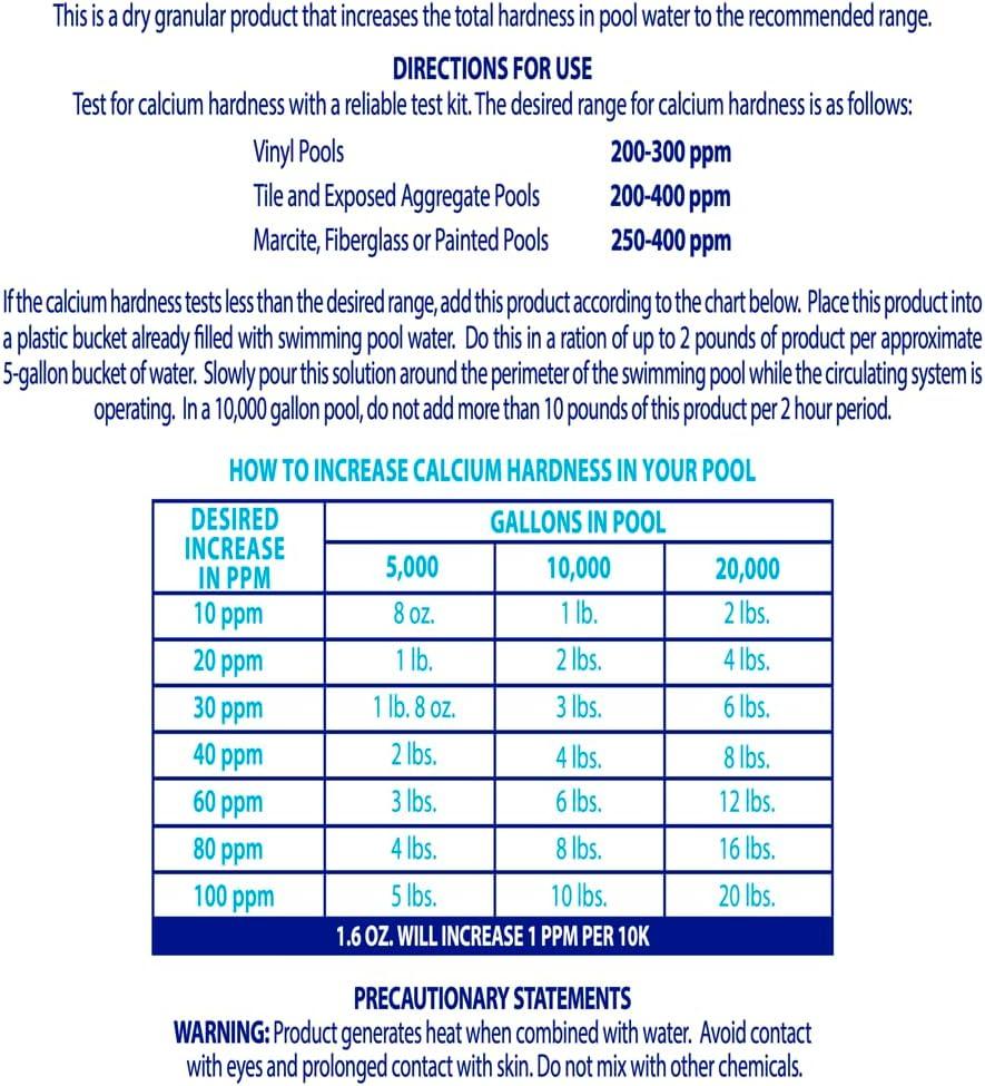 This is a dry granular product that increases the total hardness in pool water to the recommended range.Test for calcium hardness with a reliable test kit. The desired range for calcium hardness is as follows: Vinyl Pools: 200-300 ppm, Tile and Exposed Aggregate Pools: 200-400 ppm, Marcite, Fiberglass or Painted Pools: 250-400 ppm. If the calcium hardness tests less than the desired range, add this product according to the included chart. Place this product into a plastic bucket already filled with swimming pool water. Do this in a ration of up to 2 pounds of product per approximate 5-gallon bucket of water. Slowly pour this solution around the perimeter of the swimming pool while the circulating system is operating. In a 10,000 gallon pool, do not add more than 10 pounds of this product per 2 hour period.