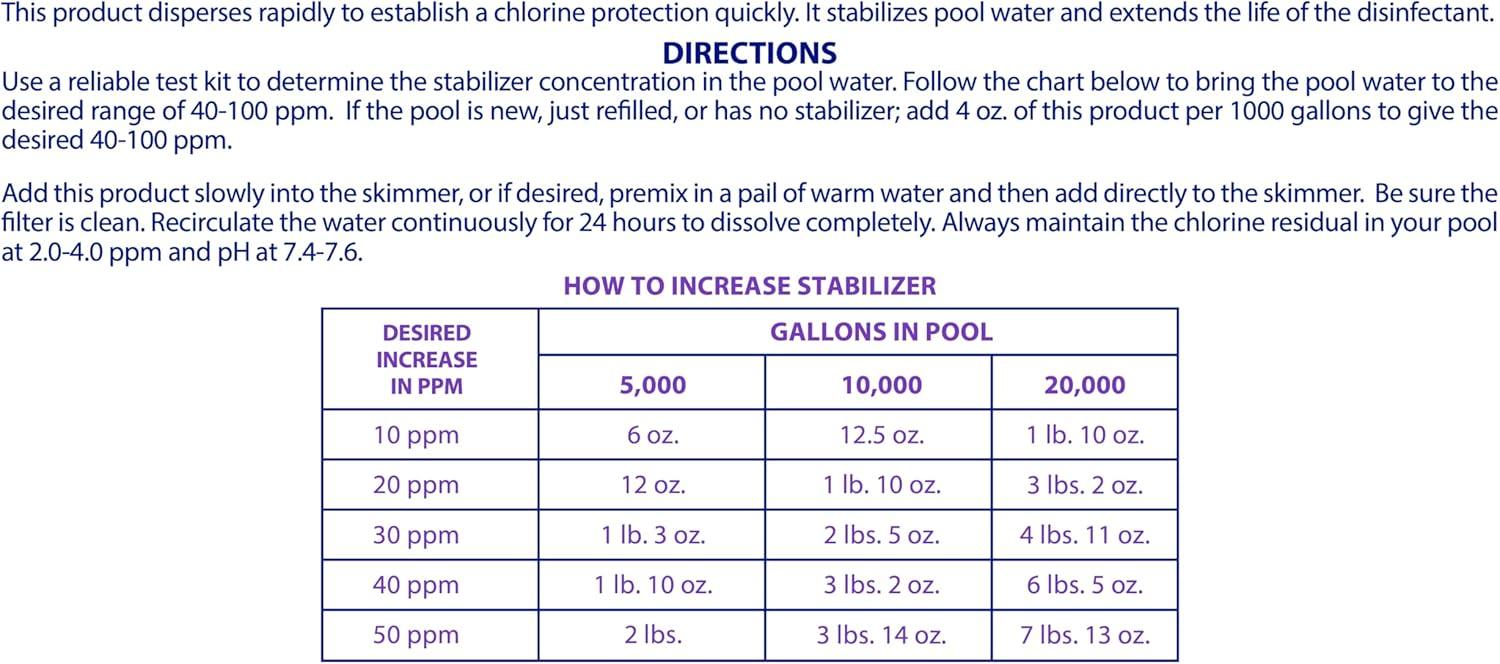 This product disperses rapidly to establish a chlorine protection quickly. It stabilizes pool water and extends the life of the disinfectant. Use a reliable test kit to determine the stabilizer concentration in the pool water. Follow the included chart to bring the pool water to the desired range of 40-100 ppm. If the pool is new, just refilled, or has no stabilizer; add 4 oz. of this product per 1000 gallons to give the desired range of 40-100 ppm. Add this product slowly into the skimmer, or if desired, premix in a pail of warm water and then add directly to the skimmer. Be sure the filter is clean. Recirculate the water continuously for 24 hours to dissolve completely. Always maintain the chlorine residual in your pool at 2.0-4.0 ppm and pH at 7.4-7.6.